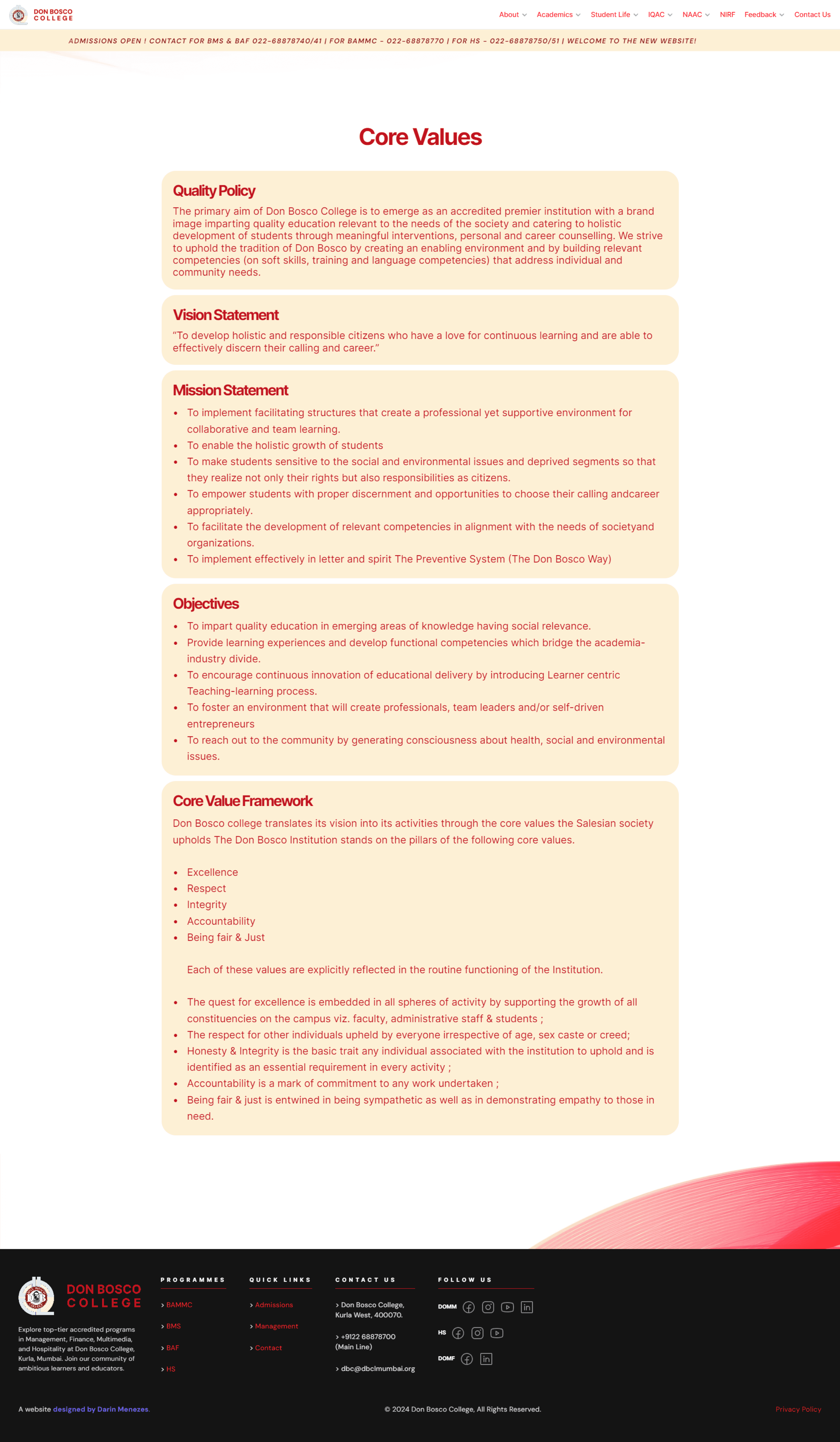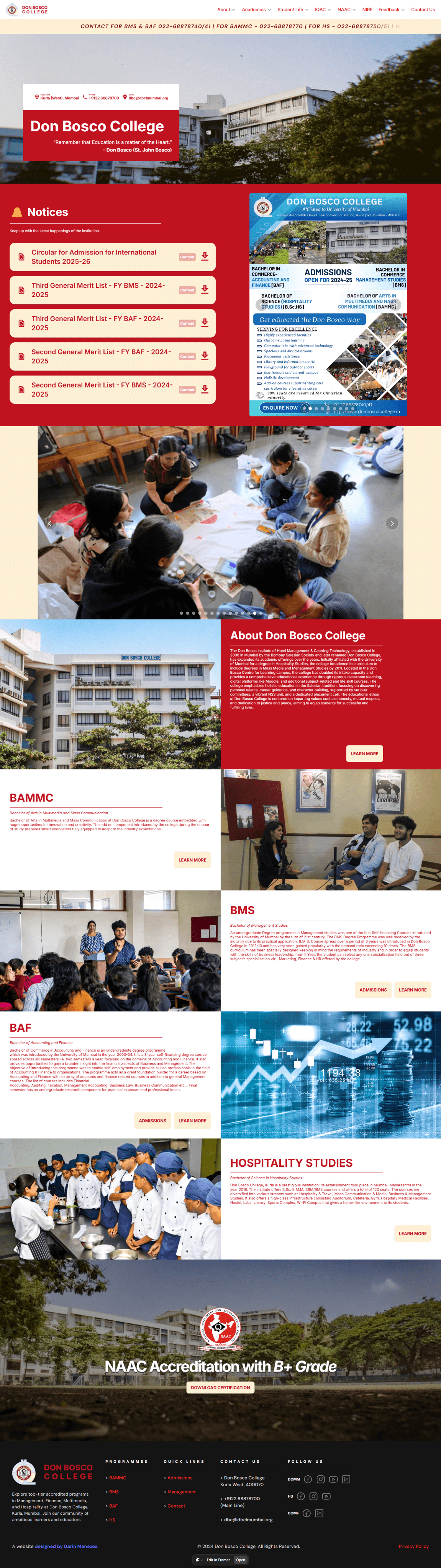 With this project for the Don Bosco College I successfully addressed the institution’s requirements by creating a user-friendly and easily maintainable website. The landing page effectively showcases the vibrant campus life, course offerings, and accreditation credentials. The document acquisition system ensures efficient management and accessibility of important documents, while the text pages allow for seamless updates of informational content.