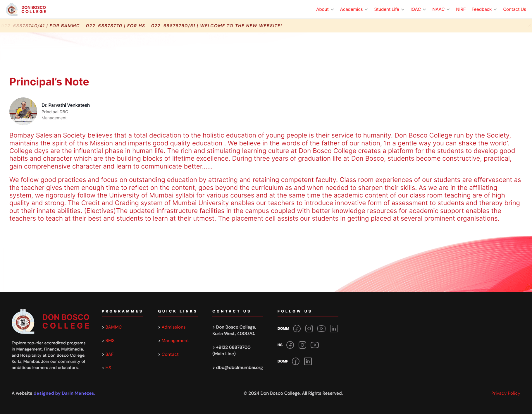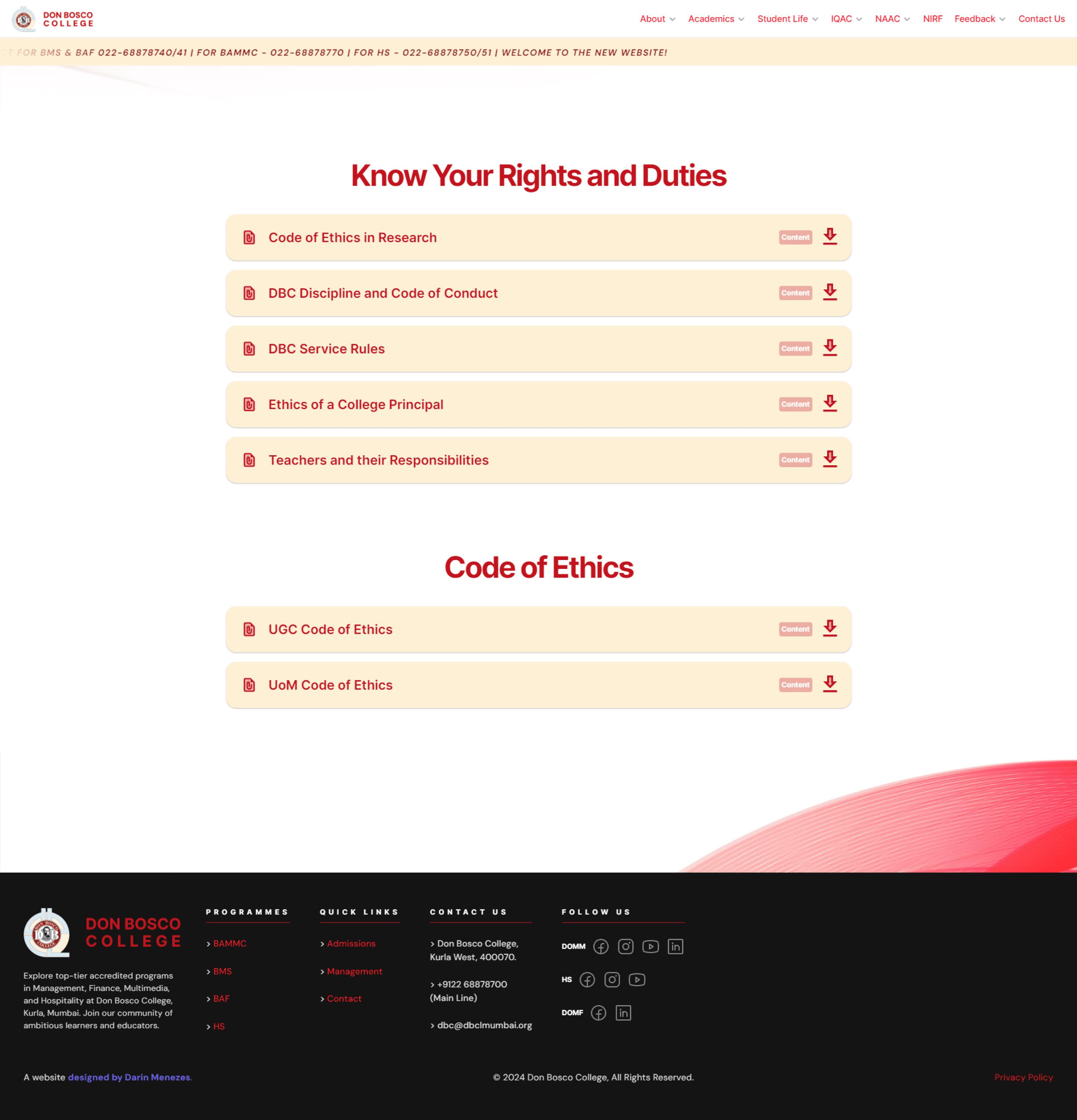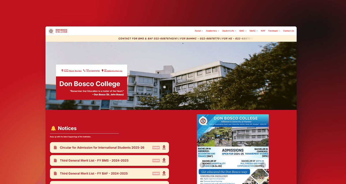 In April 2024, I led the redesign of Don Bosco College's website to create a user-friendly, easily maintainable platform. Collaborating with Prof. Neil Maheshwari and Mark Fernandes, we crafted an engaging landing page, a scalable document acquisition system, and a versatile text page CMS using Framer. This case study highlights our objectives, approaches, and solutions, enhancing the college's online presence for all visitors.